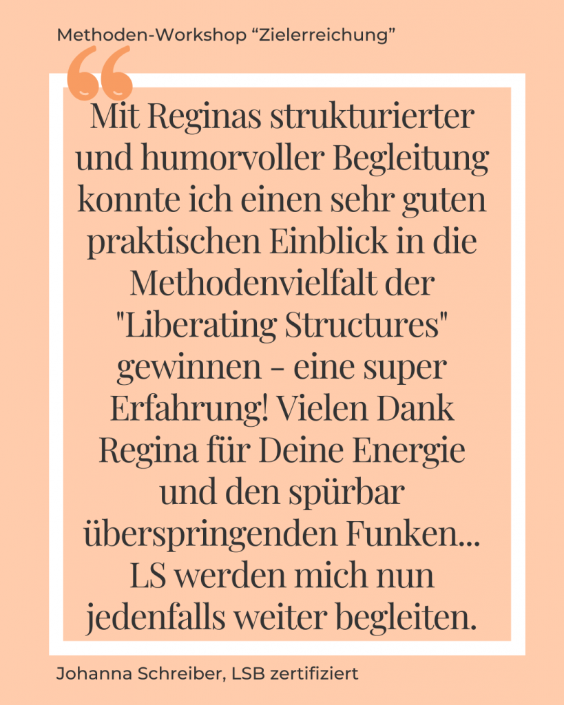 „Mit Reginas strukturierter und humorvoller Begleitung konnte ich einen sehr guten praktischen Einblick in die Methodenvielfalt der „Liberating Structures“ gewinnen – eine super Erfahrung! Vielen Dank Regina für Deine Energie und den spürbar überspringenden Funken… LS werden mich nun jedenfalls weiter begleiten.“