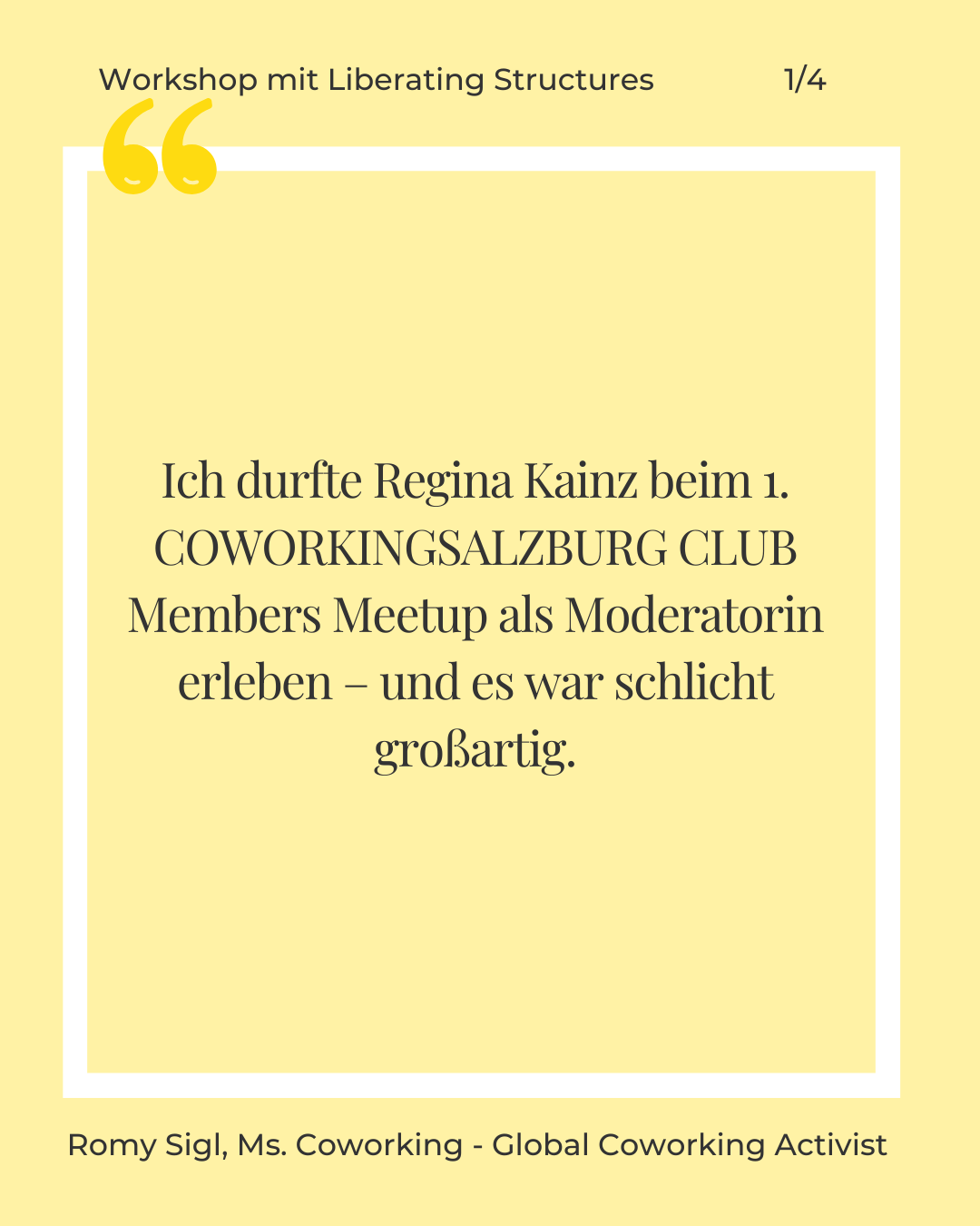 „Ich durfte Regina Kainz beim 1. COWORKINGSALZBURG CLUB Members Meetup als Moderatorin erleben – und es war schlicht großartig.